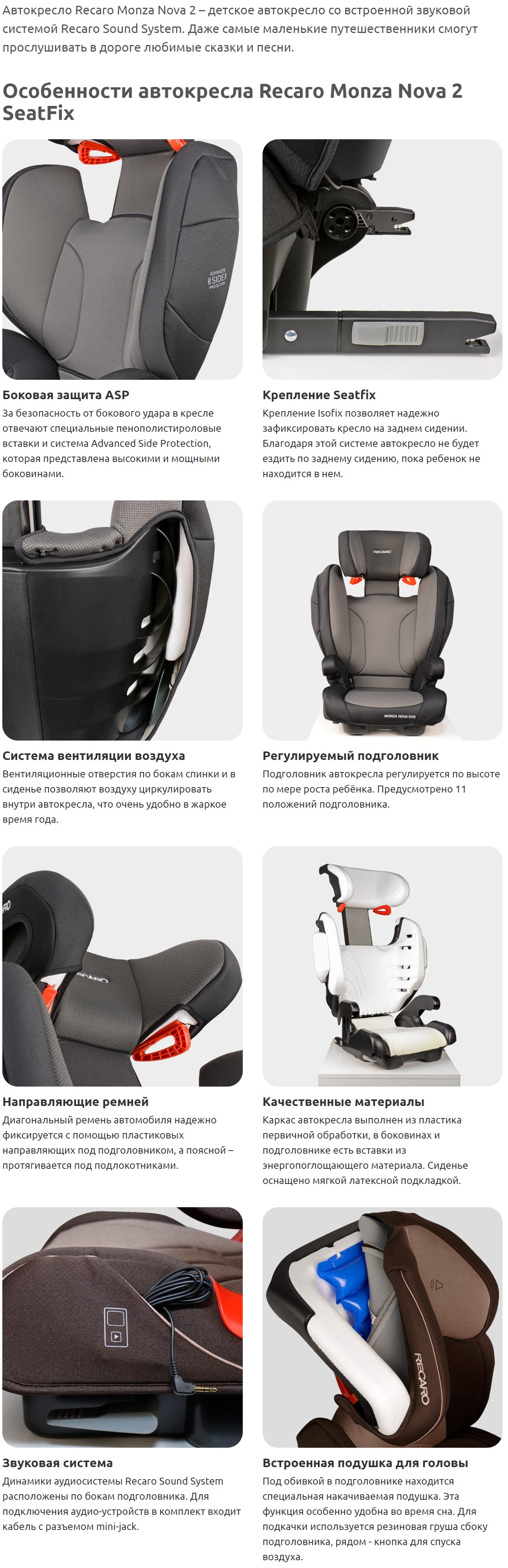 Автокресло RECARO Monza Nova II SeatFix оснащено встроенной платформой SeatFix, которая обеспечивает быструю, легкую и очень жесткую фиксацию автокресла в автомобиле. Встроенная в подголовник стерео-система Recaro Sound System создает дополнительные условия для комфорта и служит дополнительным элементом безопасности.