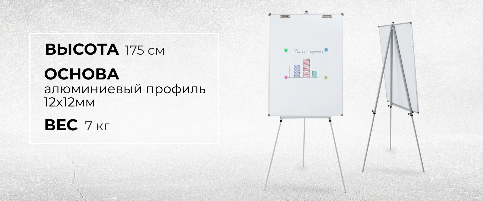 Флипчарт расположен на 3 ножках, имеющих функцию телескопического выдвижения, что позволяет с помощью зажимной ручки регулировать высоту флипчарта от 1100 мм до 1750 мм.