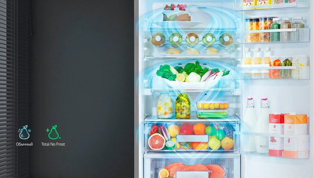 Холодильники с технологией LG Total No Frost больше не требуют разморозки морозильной камеры, благодаря принудительному обдуву холодным воздухом.