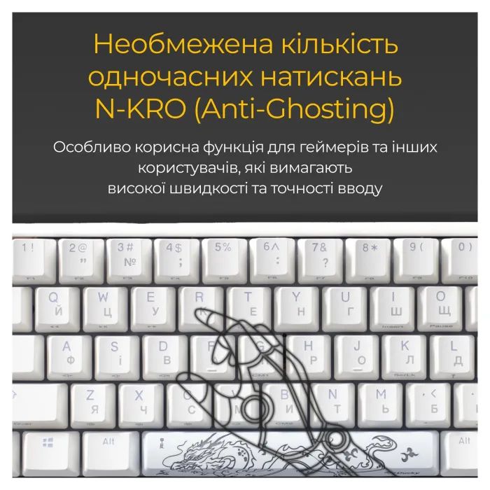 Эстетически привлекательная RGB подсветка позволяет настраивать цвета и яркость. С помощью программируемых макросов создается уникальная атмосфера, подчеркивающая ваш стиль и индивидуальность. Лазерная гравировка на прочных PBT клавишах обеспечивает долговечность и четкость символов как украинской, так и английской раскладок.