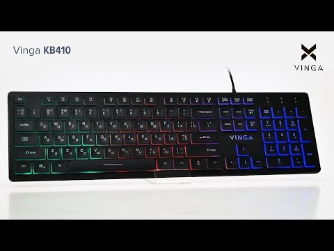 KB410 — качественная клавиатура от Vinga с интерфейсом USB. Она не относится к классу игровых, но отлично подойдет к киберспортивной сборке ПК. Верхняя панель освещается изнутри яркими, разноцветными лампами, поэтому уже одним своим видом может поднять вам настроение. Модель подключается к компьютерам и лэптопам при помощи кабеля длиной 150 см. Всего в изделии имеется 104 клавиши, среди которых есть полный ряд кнопок F, а также комплекс калькуляции NumPad. Функционал устройства рассчитан на украинскую, русскую и английскую раскладки, поэтому на него нанесена разметка с буквами из соответствующих алфавитов.