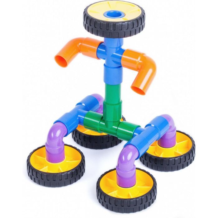 Конструктор подходит детям от 3 лет, независимо от пола. Он содержит 40 деталей, изготовленных из высокопрочного пластика. Геометрическое разнообразие элементов позволяет возводить конструкции любой сложности, а яркая палитра из 7 цветов делает игру еще более увлекательной. Детали различной формы, включая тройные и крестовые соединения, колеса, оси и прямые трубы, обеспечивают надежность и долговечность.