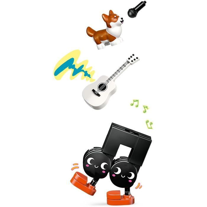 На первом этаже дети откроют музыкальный магазин с разнообразными инструментами, такими как барабаны, гитара и саксофон. Маленькие музыкальные энтузиасты смогут устраивать концерты, играя роль минифигурок Пейсли, Зака и Эльзы Д. Не менее увлекательна фигурка корги, которая добавляет веселья в игру.