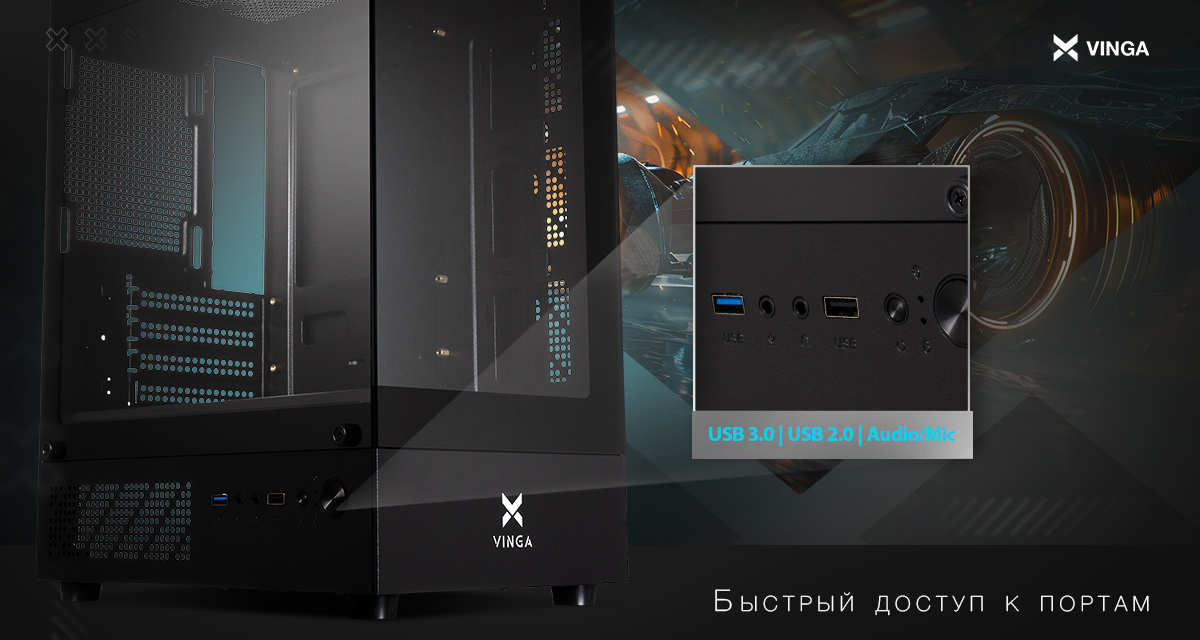 На внешней панели корпуса размещены все необходимые разъемы для быстрого подключения периферии: один USB 2.0, один USB 3.0 для быстрой передачи данных, а также два аудиоразъема для подключения наушников и микрофона. Благодаря прозрачной передней панели и окну на боковой панели корпус Vinga CS319B позволяет видеть внутренние компоненты системы и наслаждаться красотой их подсветки.