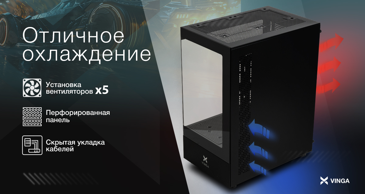 Vinga CS319B поддерживает установку до 5 вентиляторов, а перфорированная панель способствует отличной вентиляции. Внутреннее пространство корпуса продумано таким образом, чтобы скрытая укладка кабелей улучшала воздушный поток и обеспечивала аккуратный внешний вид.