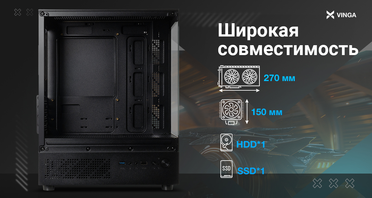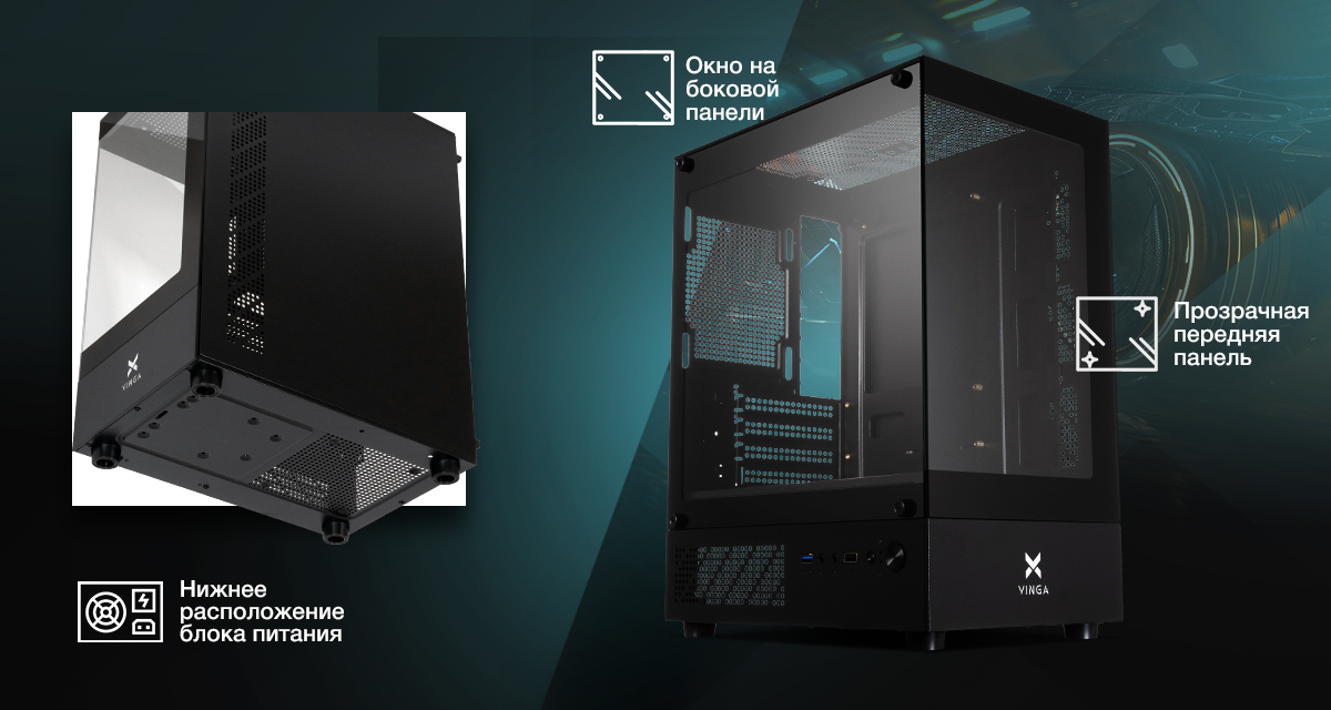Компьютерный корпус Vinga CS319B сочетает в себе современный дизайн и надежность, необходимые для создания мощной игровой системы. Агрессивные линии подчеркивают геймерский характер устройства, а прозрачные передняя и боковая панели позволяют продемонстрировать внутренние компоненты сборки. Поддержка жидкостного охлаждения формата до 240 мм обеспечивает эффективный отвод тепла при высоких нагрузках.