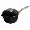 Толщина стенок ковша 2.5 мм. Изготовлен без единого шва по технологии TRI-PLY. Данная технология позволяет соединить 3 слоя металла: нержавеющая сталь-алюминий-нержавеющая сталь. Форма посуде придается без швов и каких либо соединений. Поэтому нагревание стенок и дна происходит очень быстро и долго удерживается тепло. Что позволяет не только варить, но и томить блюда в посуде, получая отменный вкус.
