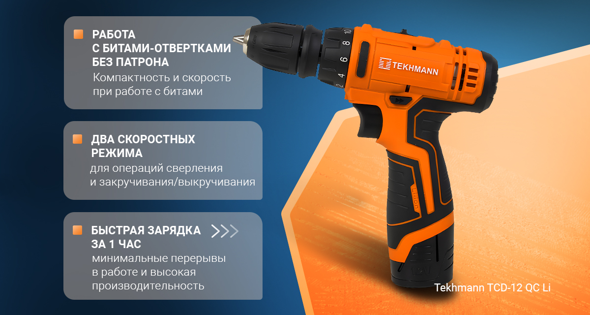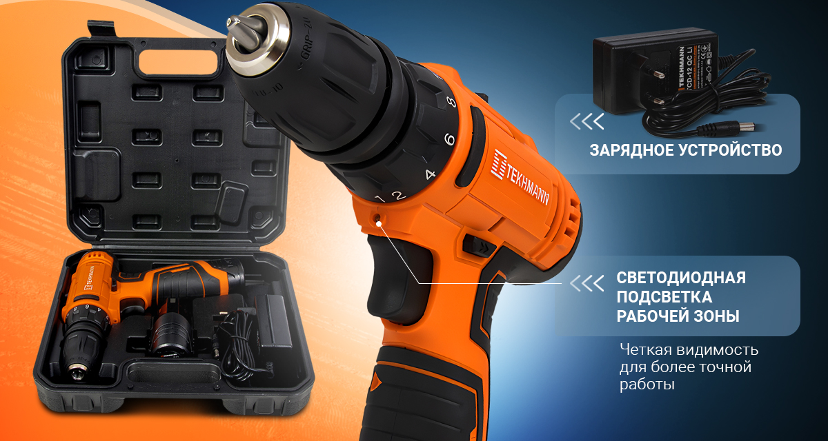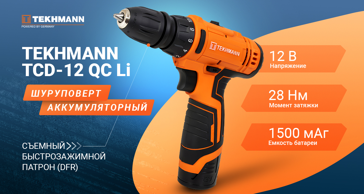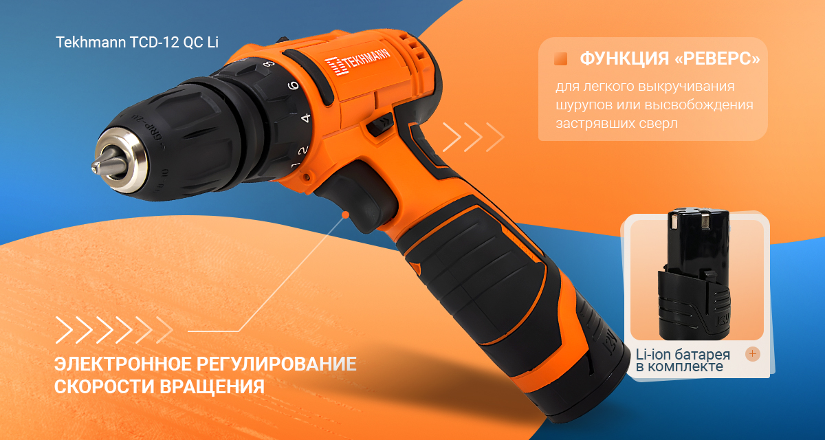 В конструкции Tekhmann TCD-12 QC Li применены: сверлильный съемный быстрозажимной патрон без ключа, электронный регулятор/выключатель для плавного изменения скорости вращения патрона в зависимости от характера выполняемых работ, реверс, механическая регулировка крутящего момента, литий-ионная аккумуляторная батарея, автономное зарядное устройство для зарядки аккумуляторных батарей изделия.