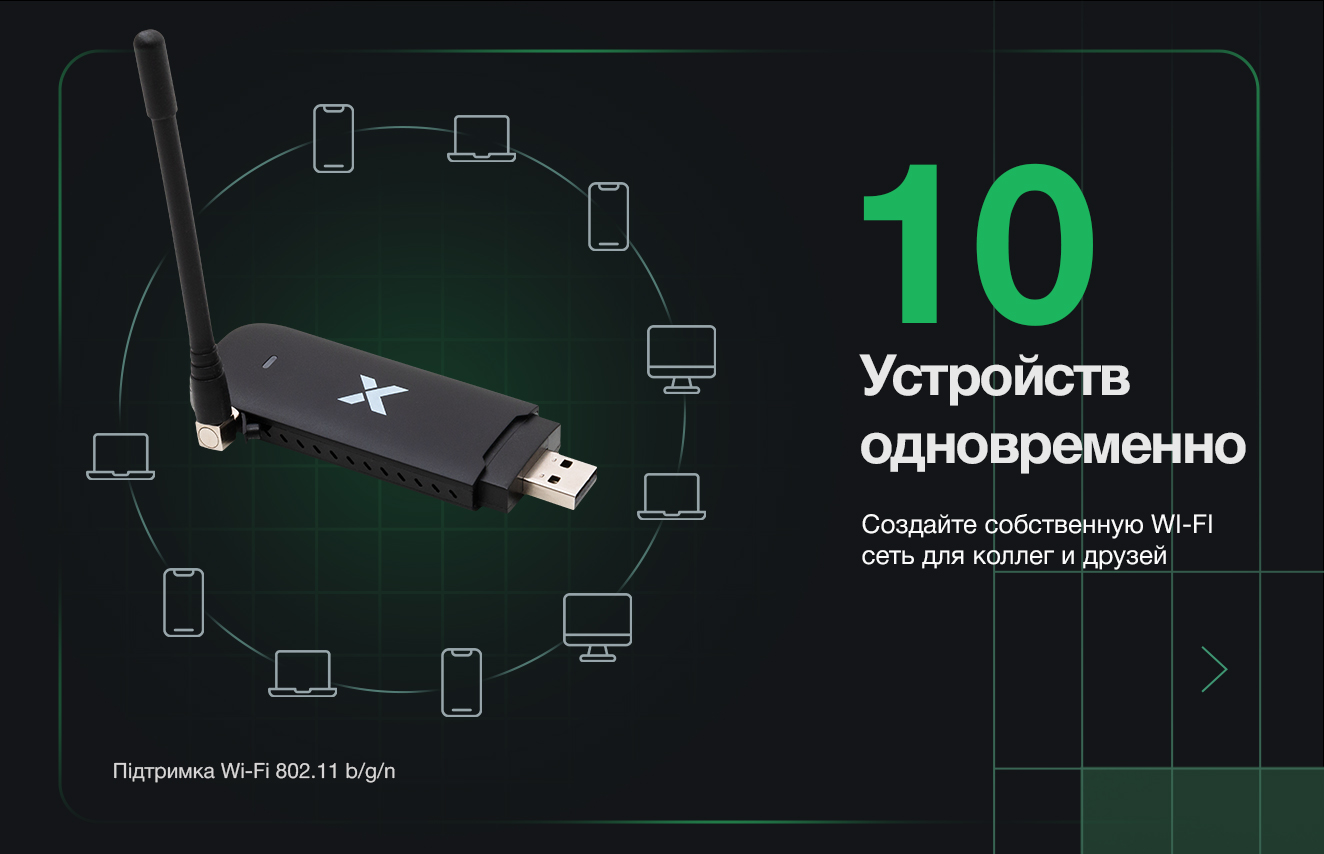 Vinga Stick 4G M101 — это больше, чем просто индивидуальный модем. Создавайте собственную защищенную сеть и делитесь интернетом с коллегами, друзьями или семьей. Устройство позволяет подключить до 10 гаджетов одновременно: смартфоны, планшеты, ноутбуки и смарт-часы будут работать слаженно. Благодаря поддержке стандартов 802.11 b/g/n, каждый подключенный пользователь получит свою долю скоростного трафика для комфортной работы, учебы или развлечений.