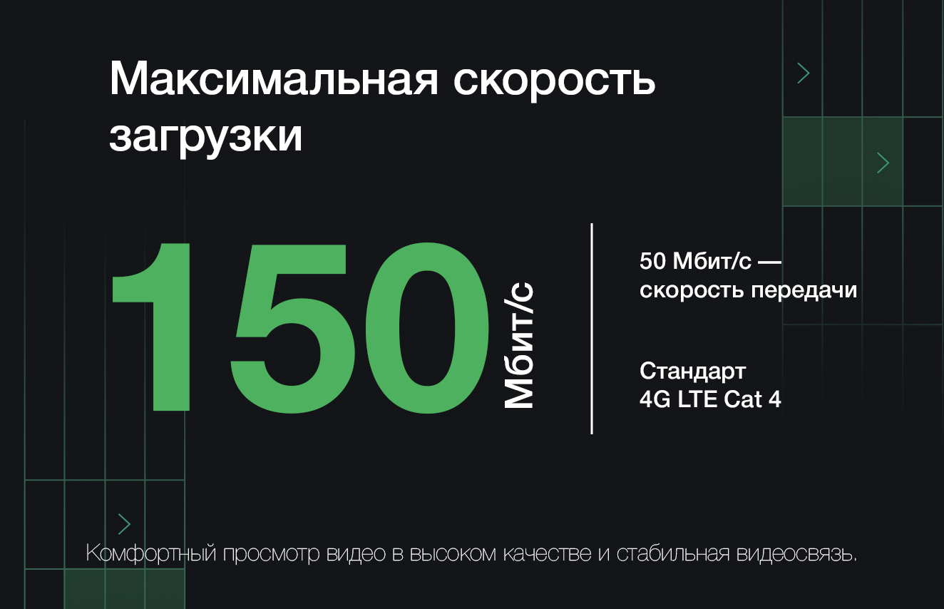 Получите максимум от сетей четвертого поколения благодаря поддержке LTE FDD и TDD. Модем обеспечивает скорость загрузки до 150 Мбит/с и отправки данных до 50 Мбит/с. Широкий набор частотных диапазонов (LTE и WCDMA) гарантирует стабильную работу со всеми украинскими и зарубежными операторами. Смотрите потоковое видео в высоком качестве, проводите стабильные видеоконференции или загружайте объемные файлы без задержек и неожиданных разрывов соединения.
