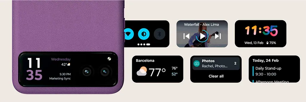 Вспомогательный дисплей стал прекрасным способом взаимодействовать с телефоном, не открывая его. На внешнюю сторону можно перенести панели приложений погоды, часов, музыкального плеера – все, что наиболее часто используется в ежедневных сценариях.