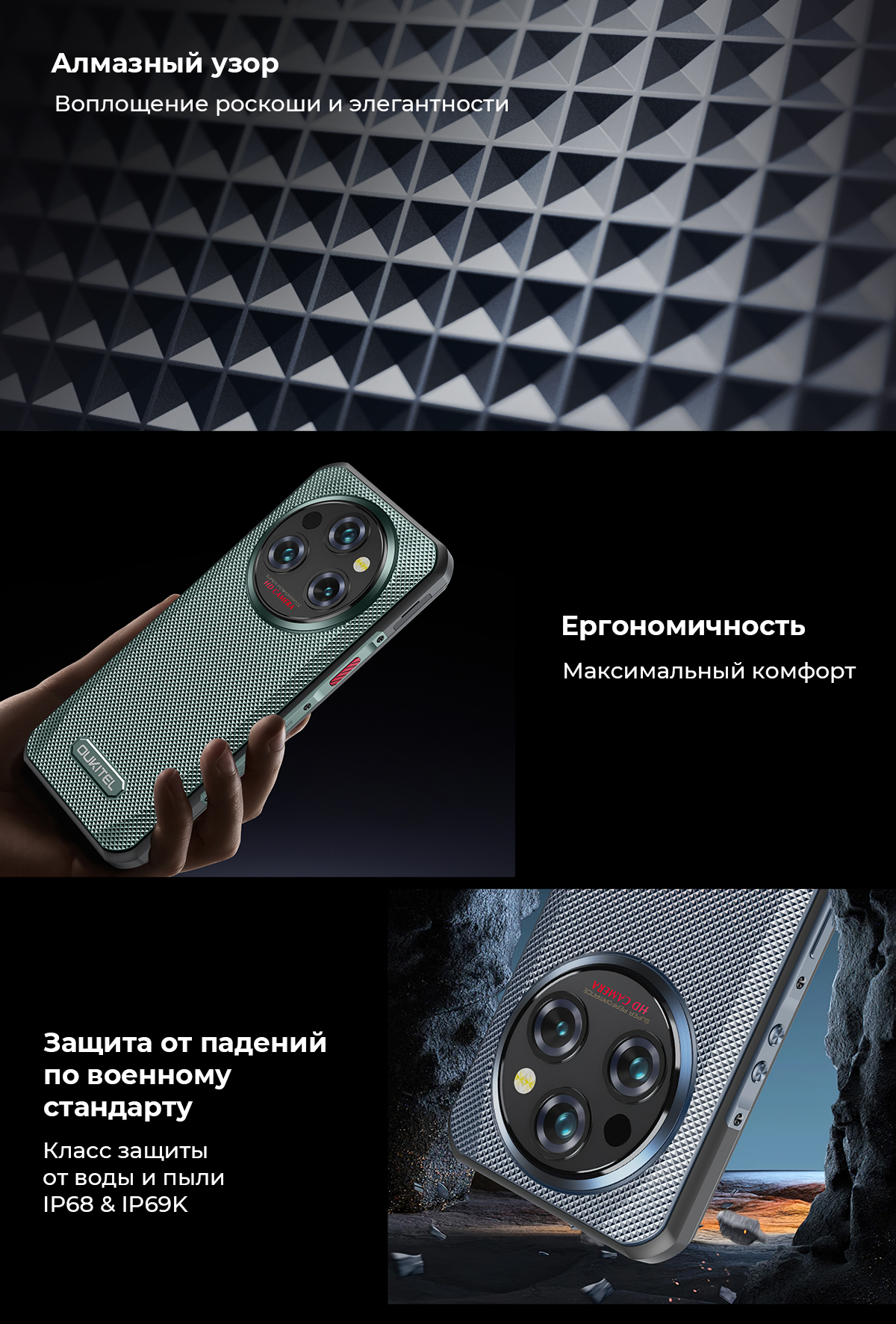 OUKITEL WP35 Pro доказывает, что настоящая защита может быть утонченной. Это самый тонкий в мире бронированный смартфон, который при толщине 14.9 мм имеет сертификацию по военным стандартам, а также высший уровень водозащиты IP68 и IP69K. Алмазный узор на задней панели добавляет устройству статусности, а мощная начинка с процессором Dimensity 6300+ гарантирует стабильность в сетях 5G. Сочетание 6.6-дюймового дисплея и камеры Sony на 64 МП позволяет владельцу создавать профессиональный контент даже в самых экстремальных путешествиях.