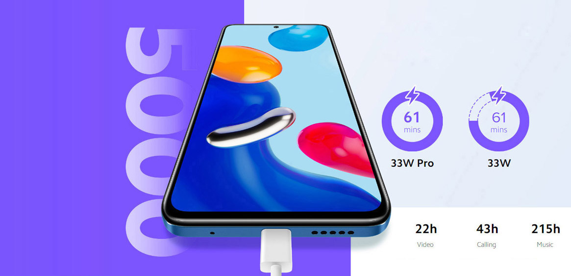 Емкая батарея. Быстрая зарядкаБатарея емкостью 5000 мАч дает возможность много часов подряд пользоваться Redmi Note 11 без подзарядки. Вам гарантировано до 22 часов воспроизведения видео или до 43 часов разговоров. Усовершенствованная технология подзарядки MMT Redmi Note и зарядка мощностью 33 Вт дают возможность полностью зарядить батарею всего за 1 час, а всего несколько минут подзарядки прямо перед выходом из дома гарантируют еще несколько часов работы смартфона.
