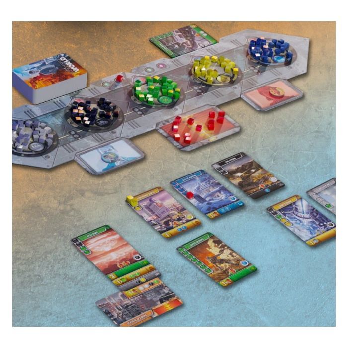 Комплектация 5 частей игрового поля 5 двусторонних карт Империй 150 карт Развития 170 кубиков Ресурсов (Материалы 35, Энергия 30, Знание 30, Деньги 30, Открытие 30, Кристаллиум 15) 80 жетонов Лидеров (40 Генералов и 40 Финансистов) жетон счетчика раундов блокнот для п