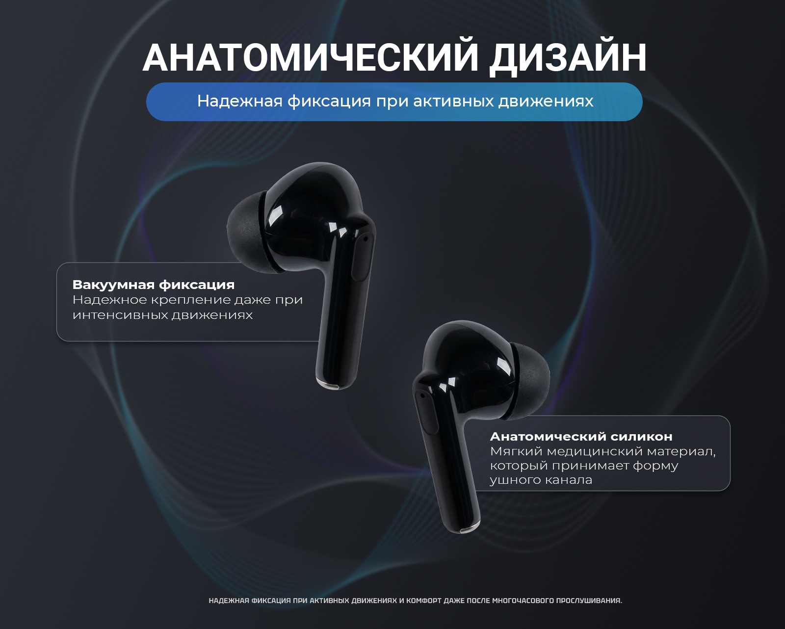 TWS (True Wireless Stereo), беспроводное, Bluetooth, закрытые, 30 Ом, Чувствительность - 110 дБ, 20 - 20000 Гц, тип излучателя - динамический, с микрофоном, Версия Bluetooth - 5.4, Материал амбушюр - силикон, 5 час, Black, 46.2 г