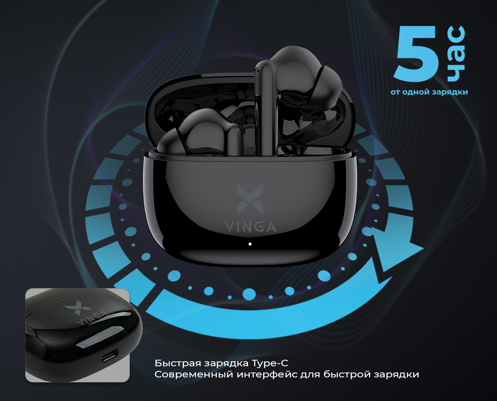 Наушники обеспечивают до 5 часов непрерывной работы, чего вполне достаточно для насыщенного рабочего дня или длительной поездки. Универсальный интерфейс USB Type-C позволяет заряжать кейс тем же кабелем, который вы используете для большинства современных гаджетов, что значительно упрощает повседневную жизнь. Быстрое восполнение энергии и длительная автономность делают Vinga HBT060 максимально практичным решением для активных людей. Вы всегда готовы к новому подкасту, важному звонку или любимому плейлисту без лишних забот об уровне заряда.