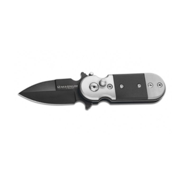 Рукоятка изготовлена из чёрного G-10 и вставок из нержавеющей стали.