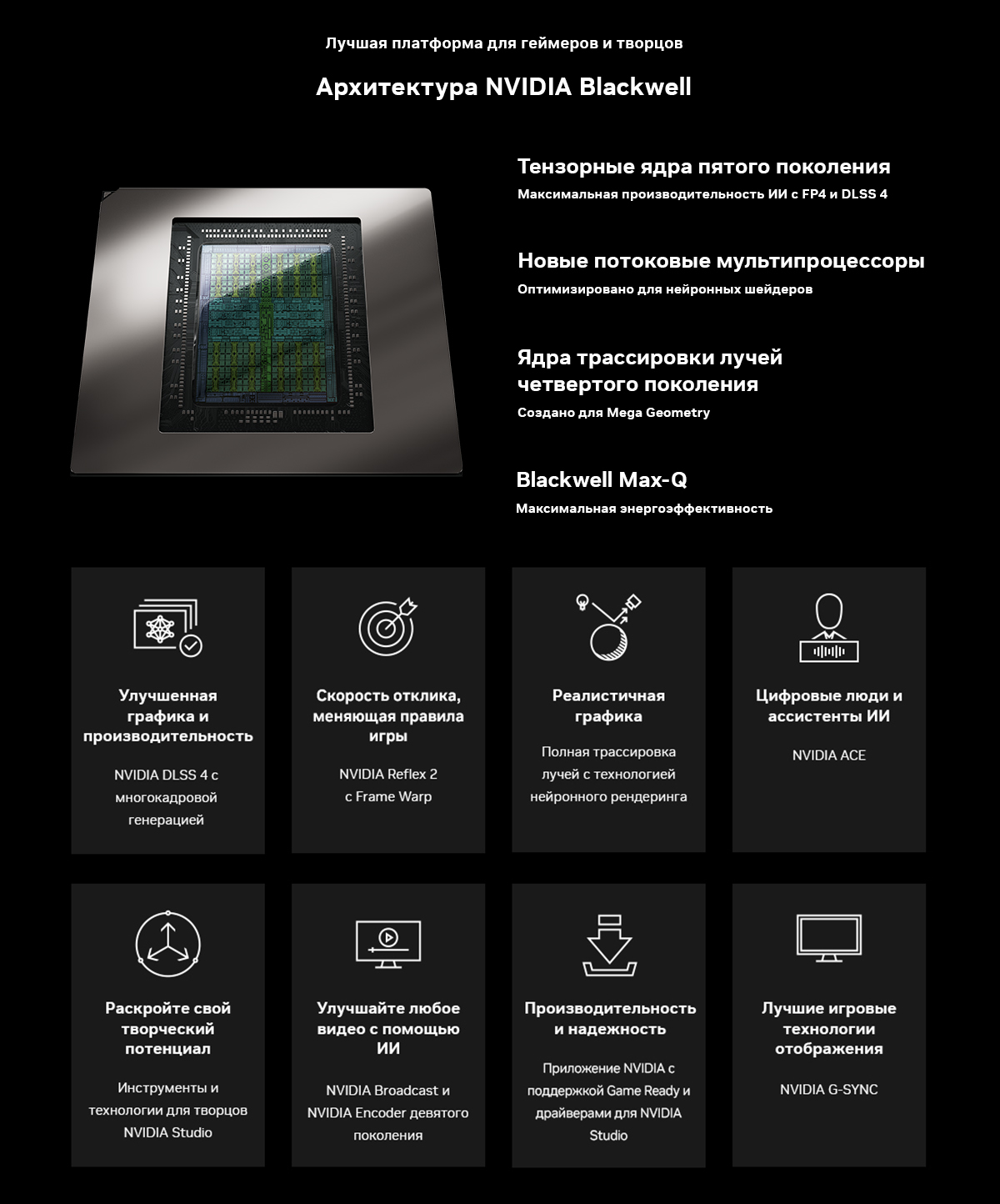 Ноутбучные графические процессоры GeForce RTX серии 50 на базе NVIDIA Blackwell открывают геймерам и создателям игровые возможности, меняющие правила игры. Оснащенные огромным уровнем мощности искусственного интеллекта, видеокарты серии RTX 50 открывают новые возможности и обеспечивают новый уровень графической точности. Умножайте производительность с помощью NVIDIA DLSS 4, создавайте изображения с беспрецедентной скоростью и раскройте свой творческий потенциал с помощью NVIDIA Studio. Все это в самых тонких и долговечных ноутбуках RTX, оптимизированных с помощью Max-Q.