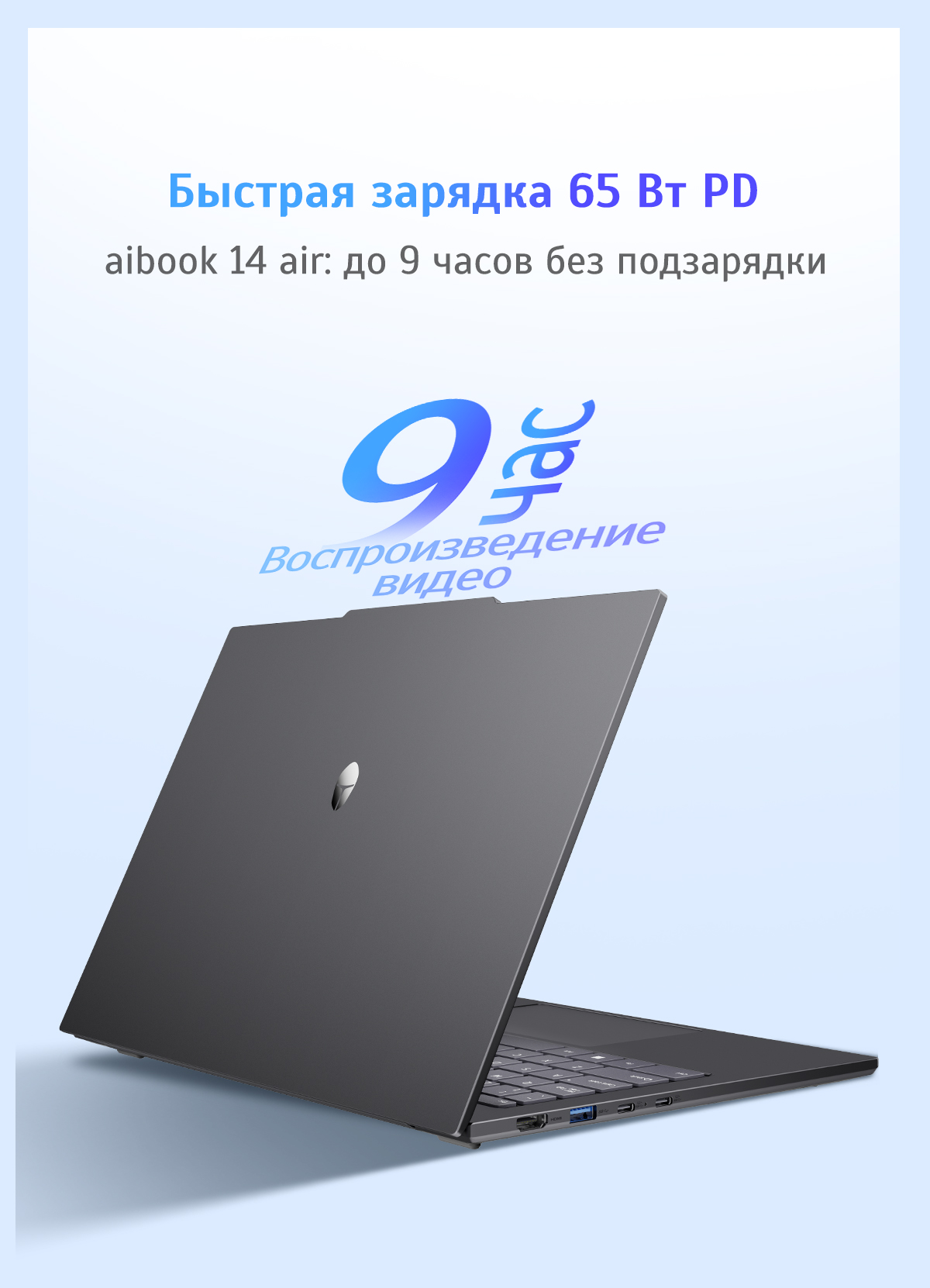 Несмотря на свою экстремальную легкость в 1 кг, Aibook 14 Air демонстрирует впечатляющие показатели автономности, обеспечивая до 9 часов непрерывного воспроизведения видео. Это стало возможным благодаря интеллектуальному управлению питанием и энергоэффективным компонентам последнего поколения. Пользователь может спокойно работать в течение всего рабочего дня или во время длительного перелета, не беспокоясь о поиске розетки. Важным техническим преимуществом является поддержка стандарта быстрой зарядки 65W PD (Power Delivery) через универсальный порт USB-C. Это позволяет использовать одно компактное зарядное устройство для ноутбука, смартфона и других гаджетов, значительно облегчая вес вашего багажа. Быстрое пополнение энергии дает возможность получить несколько часов работы всего за короткое время обеденного перерыва, обеспечивая настоящую свободу передвижения.