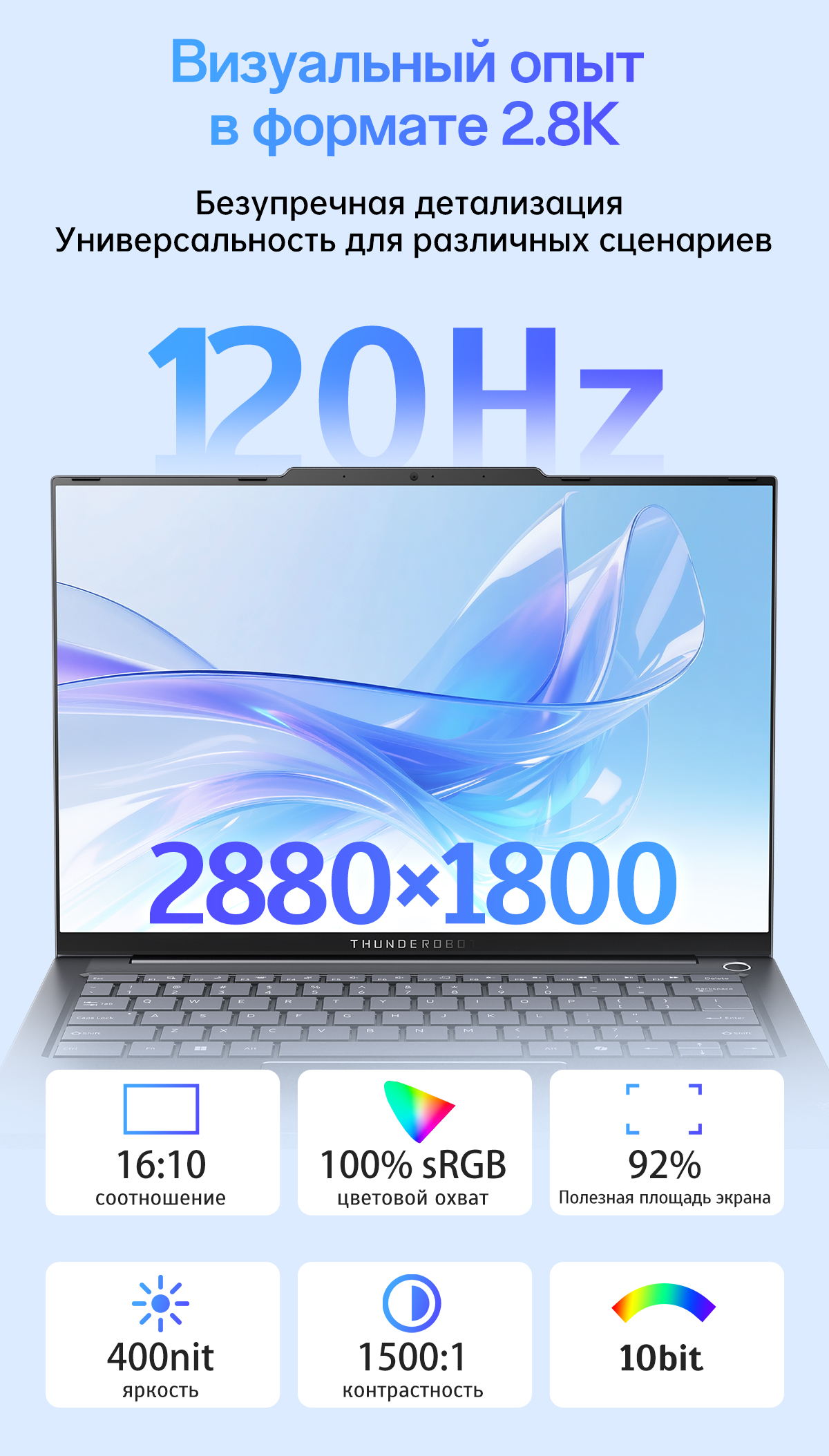 Благодаря своей 14-дюймовой диагонали и разрешению 2880x1800 (WQXGA), Thunderobot Aibook14 обеспечивает четкое и яркое воспроизведение изображений с богатыми цветами, делающими работу за ноутбуком комфортной и приятной. Панель IPS гарантирует широкие углы обзора, что позволяет наслаждаться качественным изображением как по центру, так и с боков. Частота обновления 120 Гц обеспечивает плавность отображения динамичных сцен, что делает его отличным выбором как для работы, так и для развлечений.