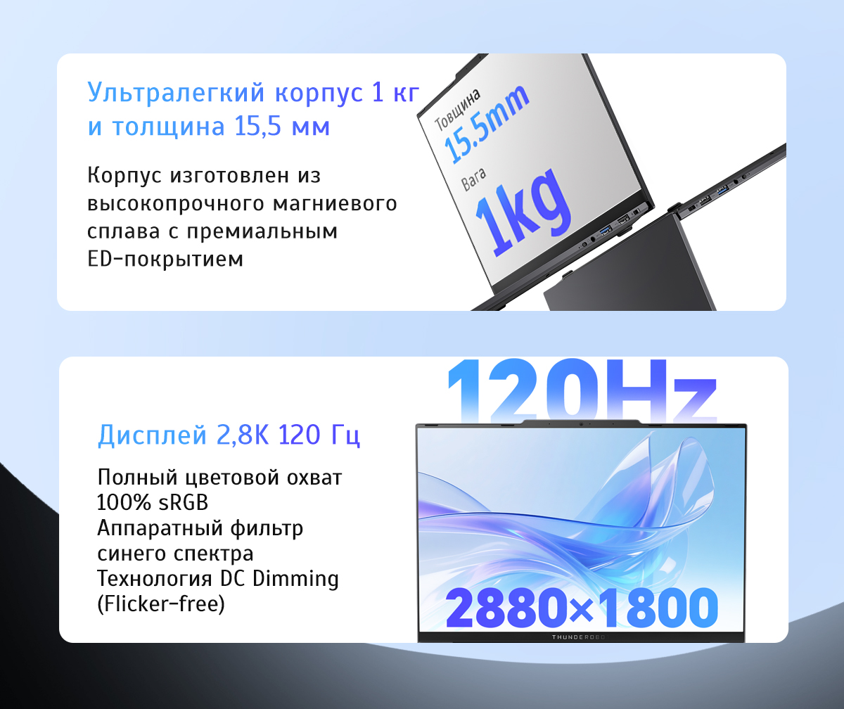 Использование магниевого сплава авиационного уровня позволило инженерам Thunderobot создать корпус, сочетающий чрезвычайную легкость с жесткостью и надежной защитой внутренних электронных компонентов. Эстетика устройства подчеркивается покрытием цвета Deep Gray, которое благодаря специальному методу нанесения обладает благородной перламутровой текстурой. Это не просто дизайнерское решение, а функциональная защита: поверхность остается устойчивой к отпечаткам пальцев и агрессивному воздействию внешней среды. Целостная структура корпуса и «теплая» на ощупь отделка поверхности выделяют ноутбук среди аналогов, подчеркивая его премиальный статус. Такой подход к материаловедению гарантирует, что устройство сохранит свой первоначальный вид даже после лет интенсивной эксплуатации в поездках и командировках, обеспечивая надежность, на которую можно полностью положиться.