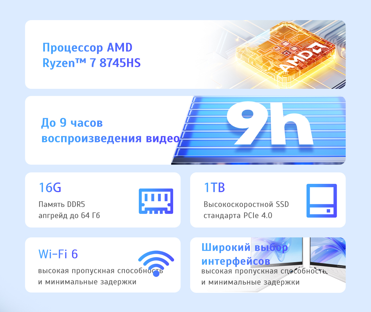 Ключевым элементом производительности является процессор AMD Ryzen 7 8745HS с архитектурой Zen 4. С 8 ядрами и тактовой частотой от 3.8 ГГц до 4.9 ГГц, он обеспечивает высокую скорость и эффективность в обработке задач различной сложности. Это особенно важно для пользователей, которые одновременно работают в нескольких программах или занимаются ресурсоёмкими проектами.