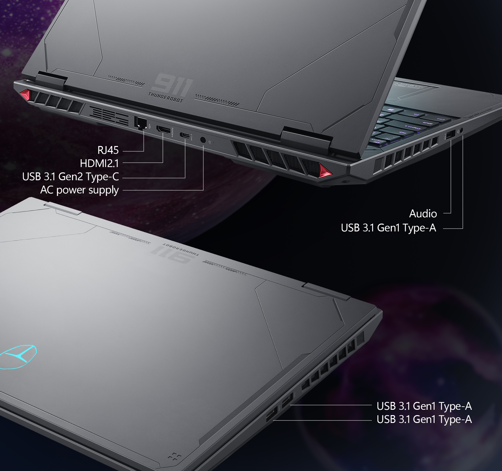 Thunderobot R16 предоставляет полную свободу подключений. С помощью порта HDMI 2.1 вы легко выведете изображение на внешний монитор, а три разъема USB 3.1 Gen1 Type-A вместе со скоростным Type-C Gen2 позволят подключить всю необходимую периферию одновременно. Для стабильного сетевого соединения в играх предусмотрен гигабитный LAN (RJ45). Продуманное расположение основных портов на задней панели освобождает рабочее пространство от лишних проводов, позволяя полностью сосредоточиться на текущей задаче.