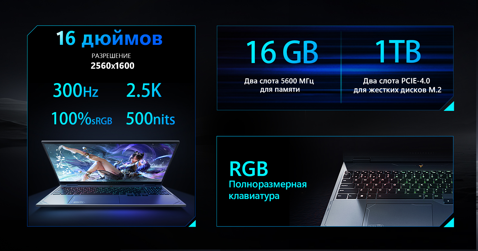 Благодаря 16-дюймовому WQXGA-экрану с разрешением 2560×1600 и частотой обновления 300 Гц, ноутбук обеспечивает невероятно плавное изображение с глубокими цветами и высокой детализацией. Яркость в 500 нит позволяет комфортно работать даже при ярком дневном освещении. Клавиатура оснащена RGB-подсветкой, полноразмерными стрелками и независимым цифровым блоком, что делает её удобной как для геймеров, так и для офисной работы. Оперативная память объемом 16 ГБ стандарта DDR5 5600 МТ/с может быть расширена до впечатляющих 96 ГБ, а для хранения данных предусмотрен SSD PCIe 4.0 на 1 ТБ с двумя слотами M.2 для создания RAID-массивов.