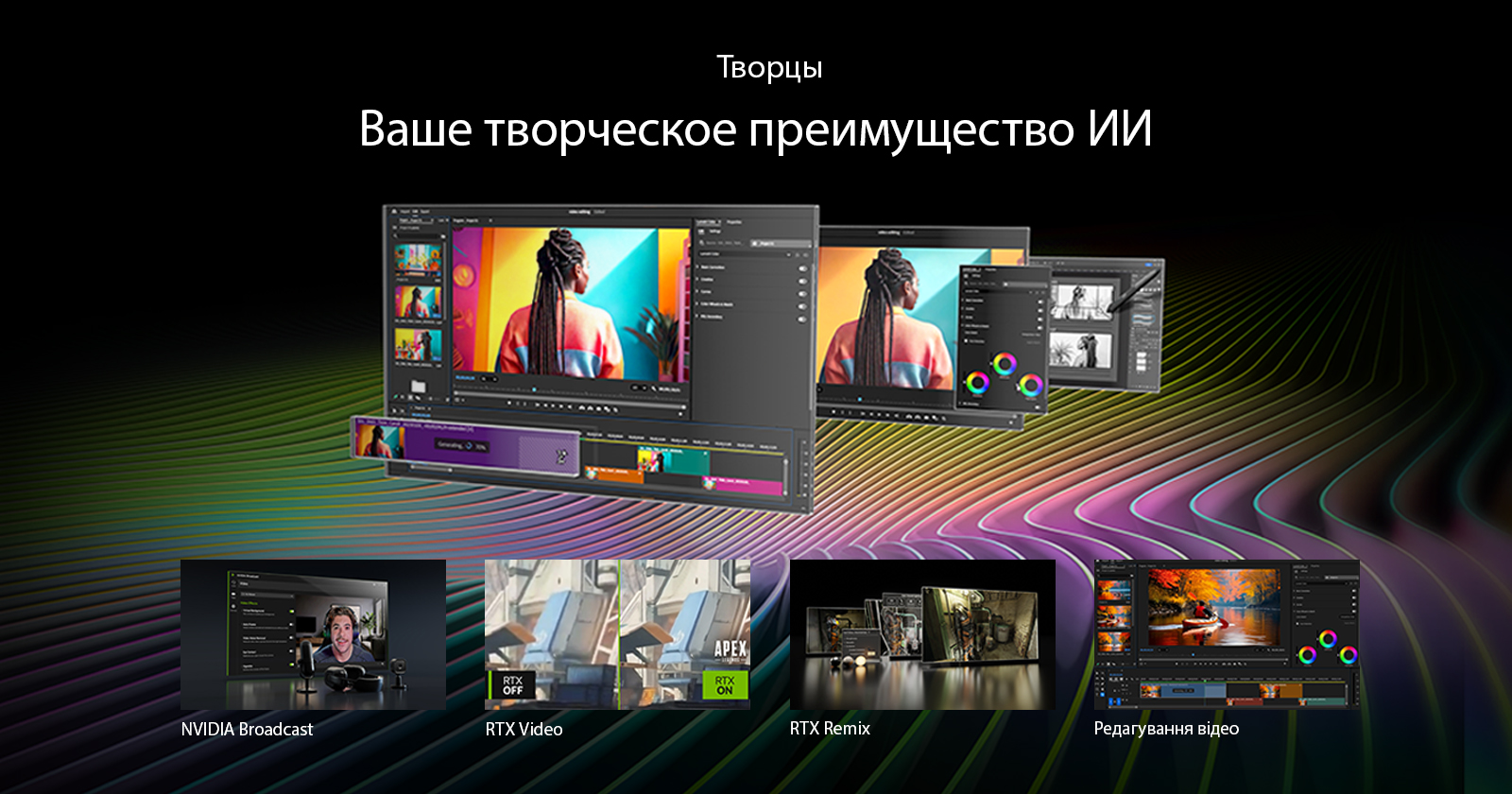 NVIDIA Studio — это ваше ключевое преимущество в работе. Графические процессоры серии GeForce RTX 50 обеспечивают трансформационную производительность в видеомонтаже, 3D-рендеринге и графическом дизайне. Вы почувствуете значительное ускорение в топовых творческих приложениях благодаря драйверам NVIDIA Studio, которые гарантируют максимальную стабильность и открывают доступ к эксклюзивным инструментам на базе ИИ.