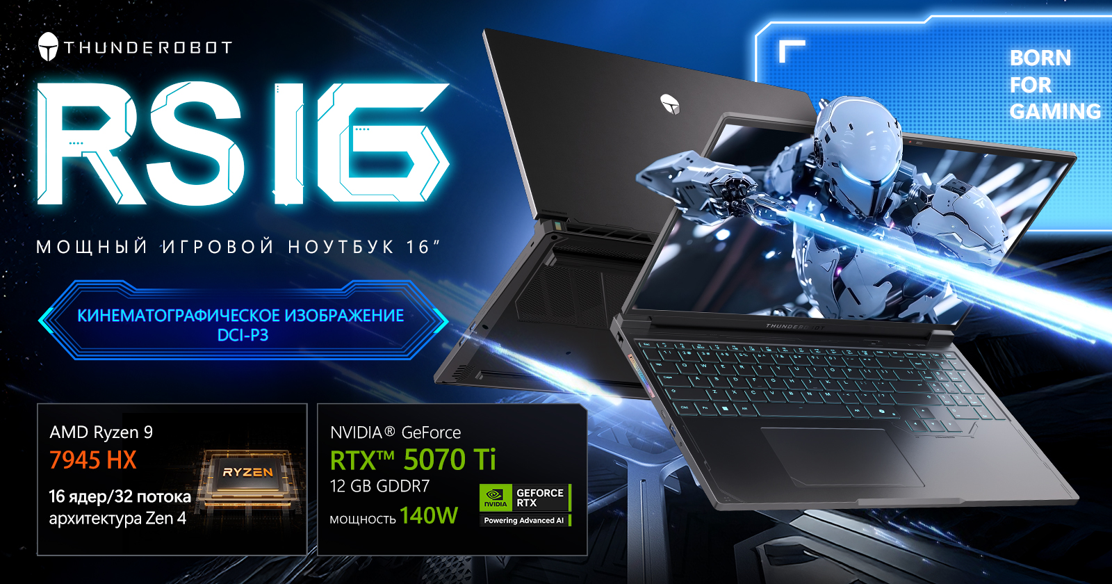 Игровой ноутбук Thunderobot RS16 создан для тех, кто ожидает максимума от производительности и графики. Его сердцем является флагманский процессор AMD Ryzen 9 7945HX (2.5 – 5.4 ГГц) — это гарантия молниеносной обработки данных в многозадачных сценариях, сложном рендеринге и AAA-играх. За графику отвечает новейшая видеокарта NVIDIA GeForce RTX 5070 Ti с 12 ГБ ультрабыстрой видеопамяти GDDR7. Она поддерживает максимальное энергопотребление 140 Вт, что позволяет использовать все возможности искусственного интеллекта, трассировки лучей и DLSS 4 на полную. Визуальные эффекты будут не только реалистичными, но и плавными даже в самых требовательных проектах. Отдельного внимания заслуживает экран с высокой точностью цветопередачи (DCI-P3), что делает ноутбук отличным вариантом также для дизайнеров, видеомонтажеров и креаторов контента.