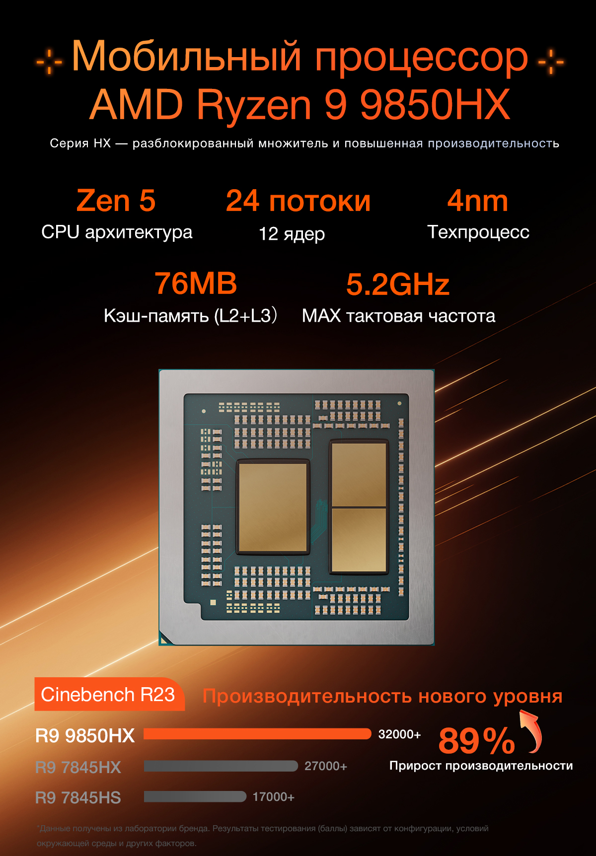 Основу быстродействия системы составляет мобильный процессор AMD Ryzen 9 9850HX серии HX, отличающийся разблокированным множителем для максимальной производительности. Построенный на новейшей архитектуре Zen 5 с использованием 4-нм техпроцесса, чип объединяет 12 ядер и 24 потока для выполнения сложнейших вычислений. Впечатляющая тактовая частота 5,2 ГГц в сочетании с 76 МБ кэш-памяти L2+L3 гарантирует мгновенный отклик, а тесты Cinebench R23 демонстрируют прирост мощности на 89%, выводя гейминг на качественно новый уровень.