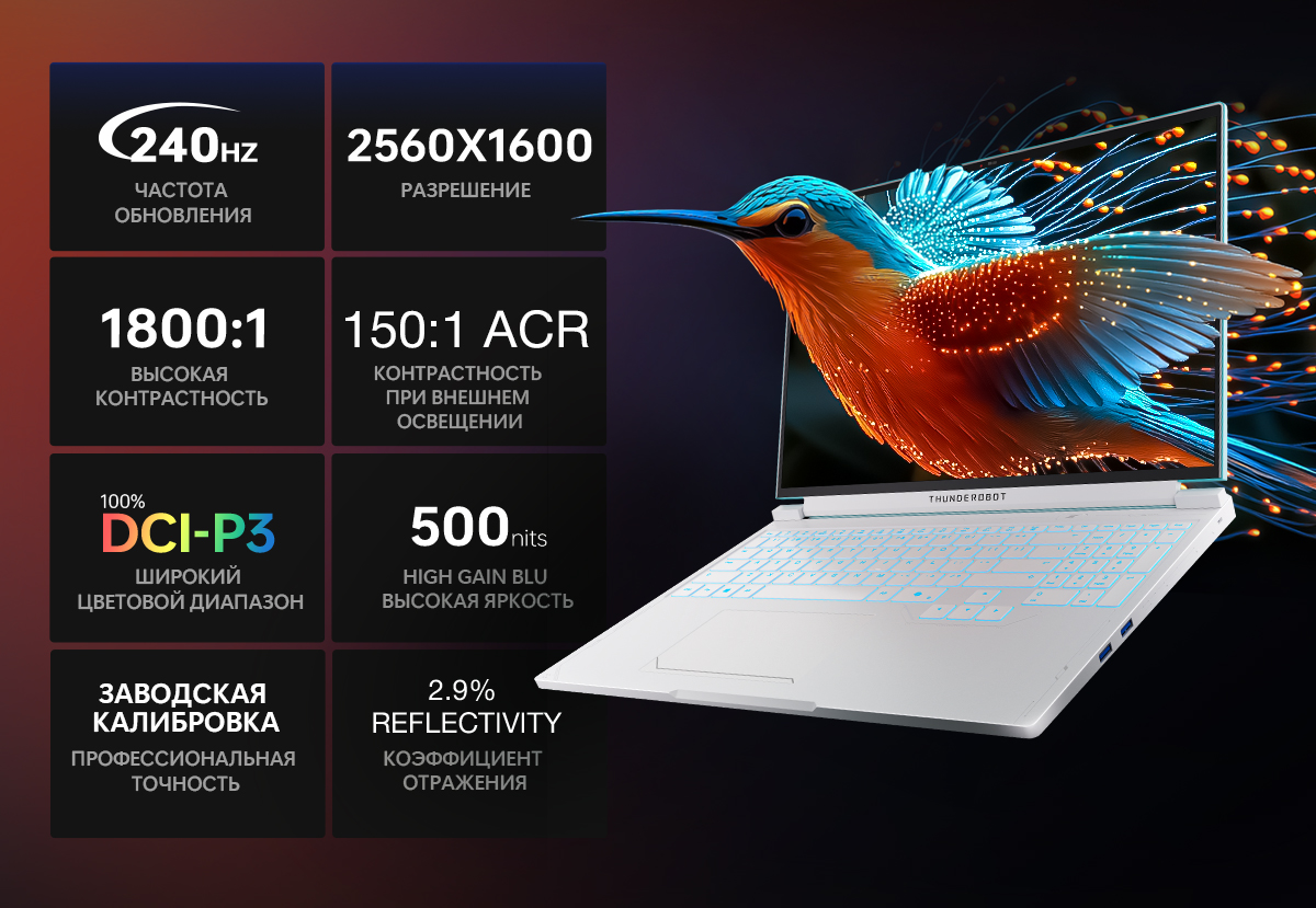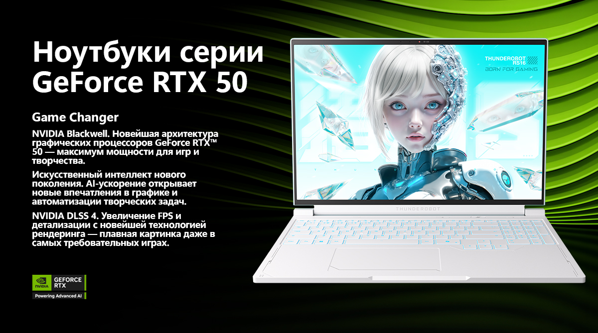 Thunderobot RS16 объединяет передовые технологии для бескомпромиссного гейминга. В основе системы лежит процессор AMD Ryzen 9 9850HX с новейшей архитектурой Zen 5, обеспечивающий молниеносное быстродействие в ресурсоемких задачах. Графическую мощь гарантирует дискретная видеокарта NVIDIA GeForce RTX 5070 Ti с 12 ГБ памяти, открывающая доступ к реалистичному изображению. IPS-экран с частотой обновления 240 Гц делает каждое движение в кадре невероятно плавным, предоставляя существенное преимущество в динамичных игровых баталиях.