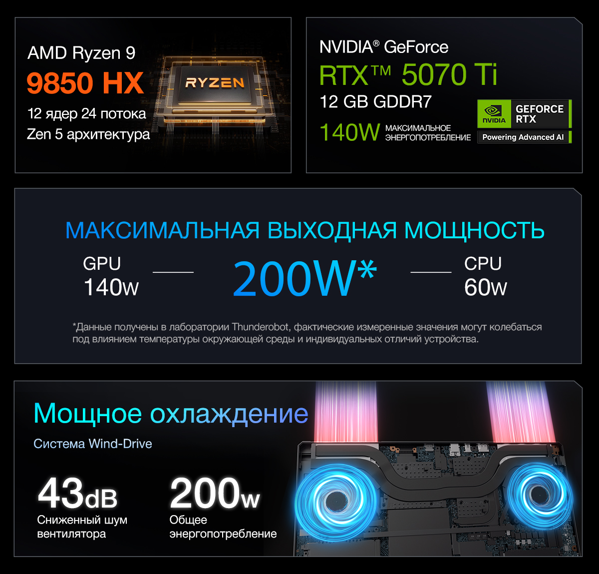 Ноутбук оснащен передовым 12-ядерным процессором AMD Ryzen 9 9850HX на архитектуре Zen 5, что гарантирует бескомпромиссную скорость обработки данных. Графическую мощь обеспечивает видеокарта NVIDIA GeForce RTX 5070 Ti с 12 ГБ новейшей памяти GDDR7 и потреблением 140 Вт. Общая выходная мощность системы достигает 200 Вт, эффективно распределяясь между видеокартой и процессором для стабильного гейминга. Инновационная система охлаждения Wind-Drive поддерживает оптимальные температуры при сниженном уровне шума 43 дБ, создавая комфортные условия даже во время пиковых нагрузок.