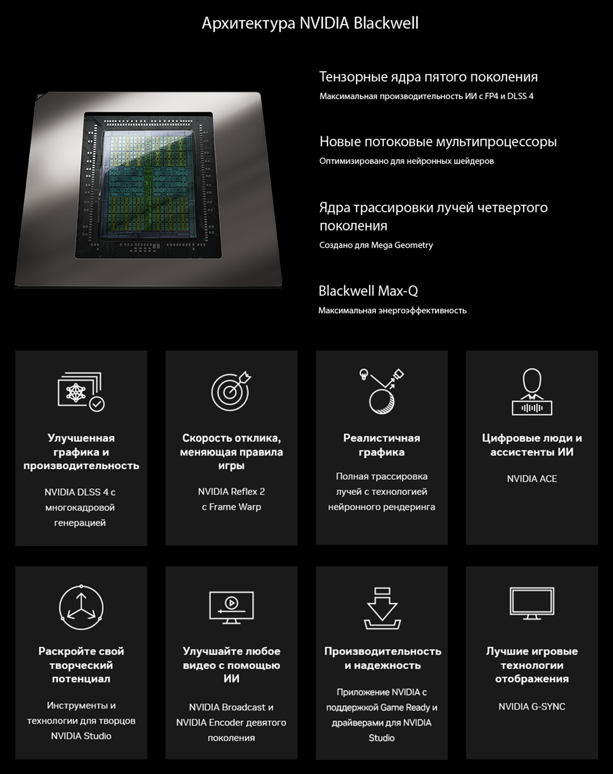 Ноутбук базируется на передовой платформе NVIDIA Blackwell, являющейся идеальным фундаментом для игр и контента. Пятое поколение тензорных ядер обеспечивает выдающуюся производительность ИИ с поддержкой форматов FP4 и DLSS 4. Новые мультипроцессоры оптимизированы для работы с нейронными шейдерами, а обновленные ядра трассировки лучей мастерски обрабатывают сложные сцены. Технология Blackwell Max-Q дополнительно оптимизирует энергопотребление системы.