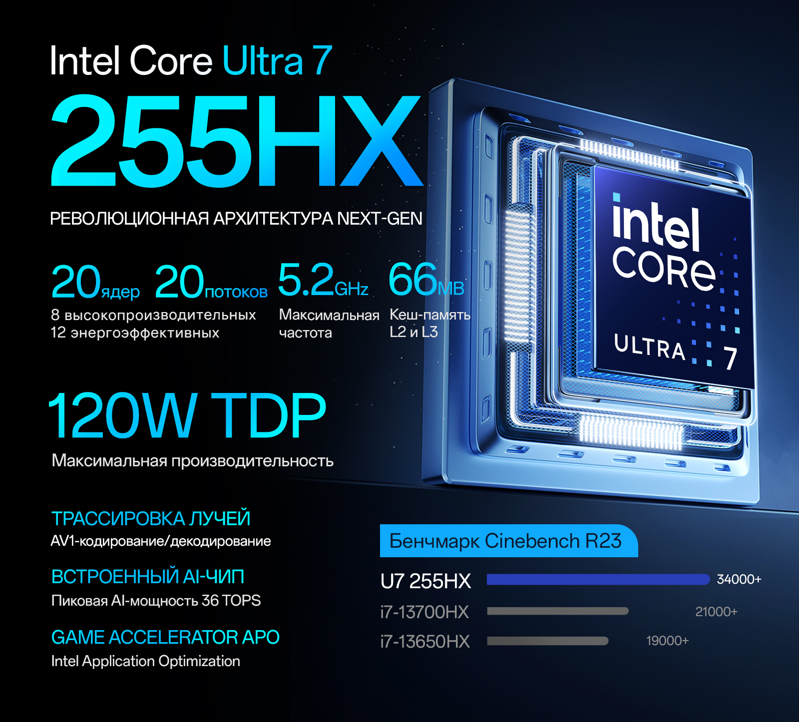 Thunderobot Zero 18 Pro оснащён Intel Core Ultra 7 255HX нового поколения, открывающим новые горизонты производительности. 20 ядер (8 высокопроизводительных и 12 энергоэффективных) и 20 потоков позволяют одновременно решать самые сложные задачи, а частота до 5,2 ГГц обеспечивает мгновенную реакцию. 66 МБ кэша и TDP 120 Вт гарантируют стабильность, а встроенный AI-чип с производительностью до 36 TOPS ускоряет обработку интеллектуальных задач.