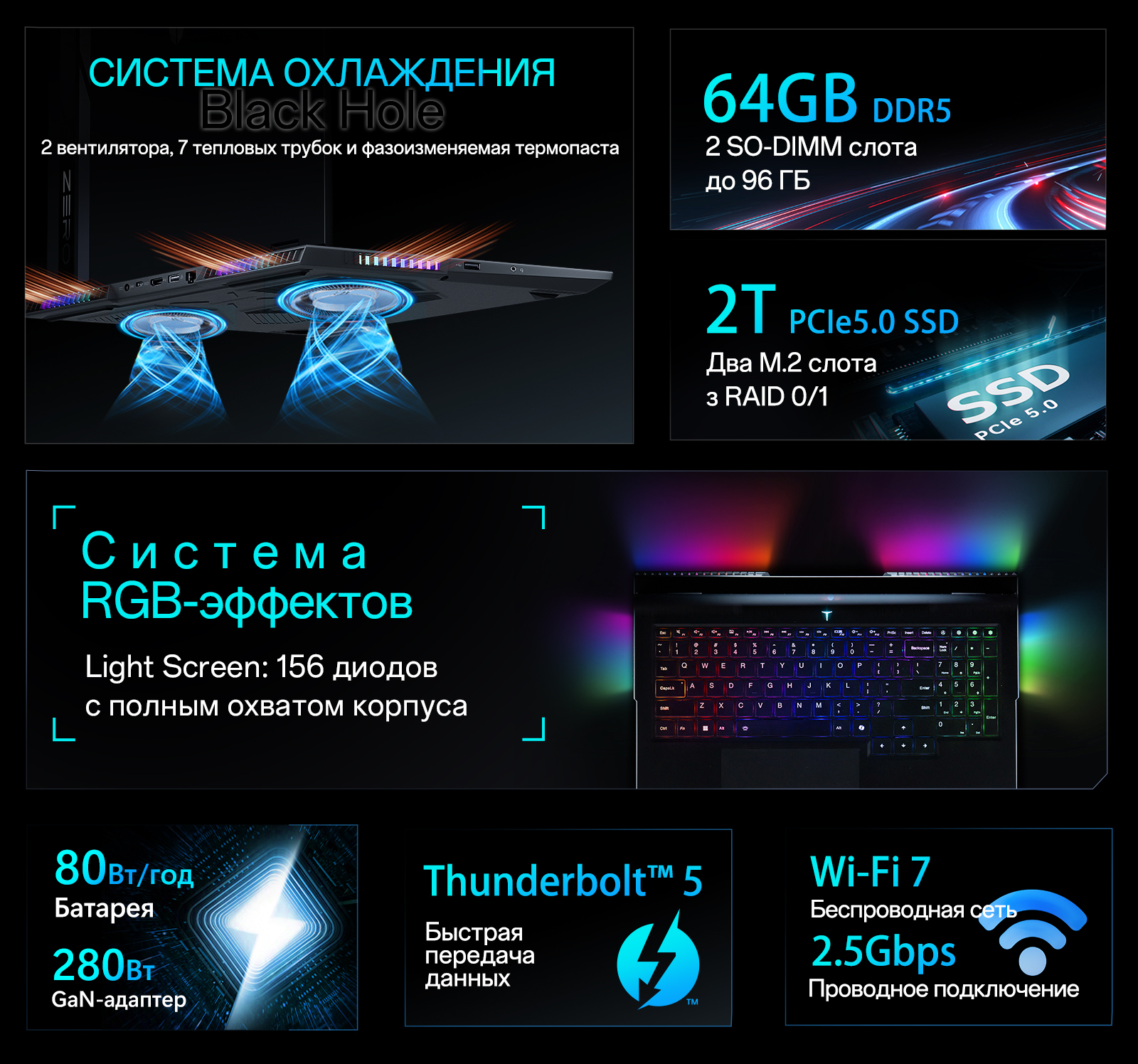 Стабильность в самых горячих игровых баталиях обеспечивает модернизированная система охлаждения Black Hole. Она использует комбинацию из 3 вентиляторов, 7 тепловых трубок и инновационной термопасты с фазовым переходом для быстрого отвода тепла от мощных чипов. Энергию для длительных сессий обеспечивает батарея емкостью 99 Вт·ч, которая поддерживает быструю зарядку через порт PD 100 Вт. Коммуникационные возможности усилены интерфейсом Thunderbolt 5, модулем Wi-Fi 7 и сетевой картой 2.5 Гбит/с для игры без малейших лагов.