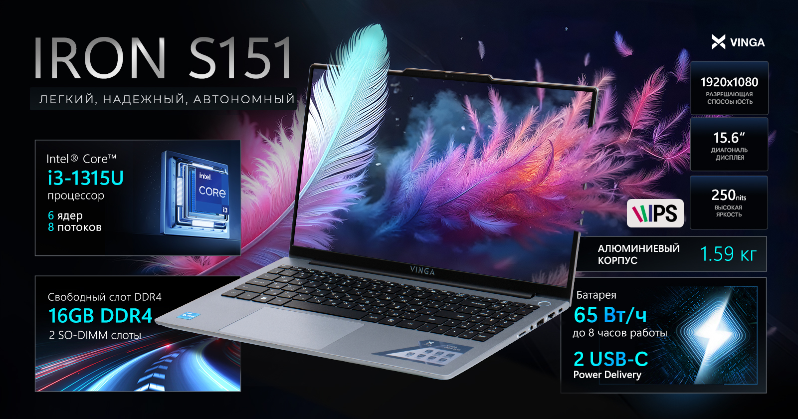 Новый Vinga Iron S151 — это универсальный ноутбук, созданный для максимальной мобильности и надежности в бизнес-среде, учебе и повседневной жизни. Он стал исключительно компактным и легким, его вес составляет всего 1590 граммов. Корпус почти полностью выполнен из алюминия (крышка и нижняя часть), что придает ощущение премиального качества и обеспечивает высокую долговечность конструкции.