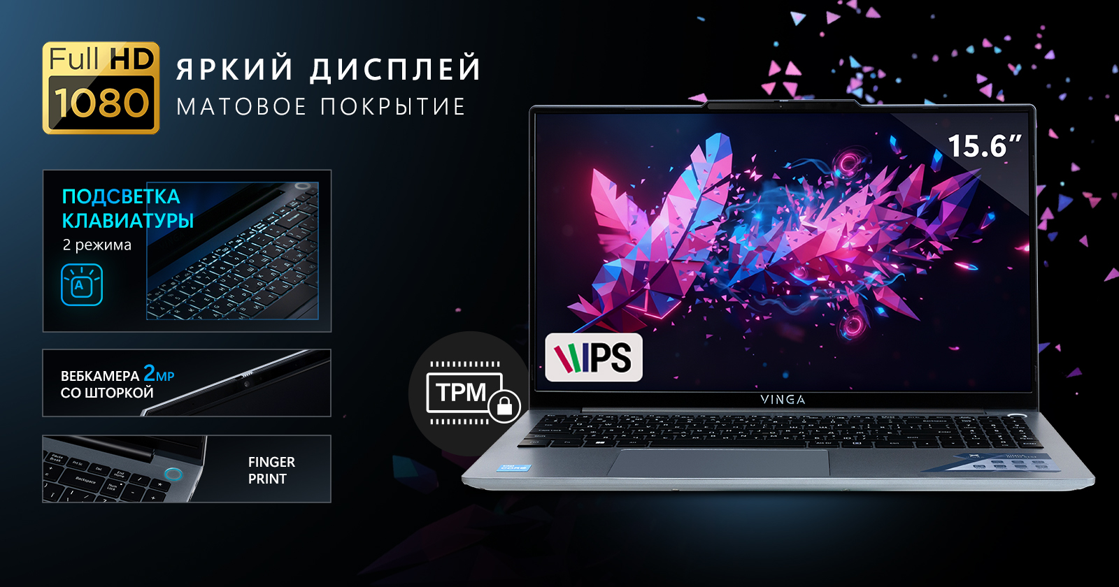 Работа с ноутбуком будет максимально комфортной и безопасной. 15,6-дюймовый FHD IPS матовый дисплей обеспечивает качественное изображение с естественными цветами, а матовое покрытие эффективно минимизирует блики, снижая нагрузку на глаза при длительной работе. Клавиатура имеет двухуровневую подсветку для удобства работы в условиях слабого освещения, позволяя продолжать рабочую сессию. Встроенный в кнопку питания сканер отпечатков пальцев (Finger Print) обеспечивает мгновенную и безопасную авторизацию в системе, ускоряя рабочий процесс. Для корпоративной безопасности и защиты важных данных предусмотрен аппаратный модуль шифрования TPM, а приватность во время видеозвонков гарантирует 2 МП веб-камера со шторкой.