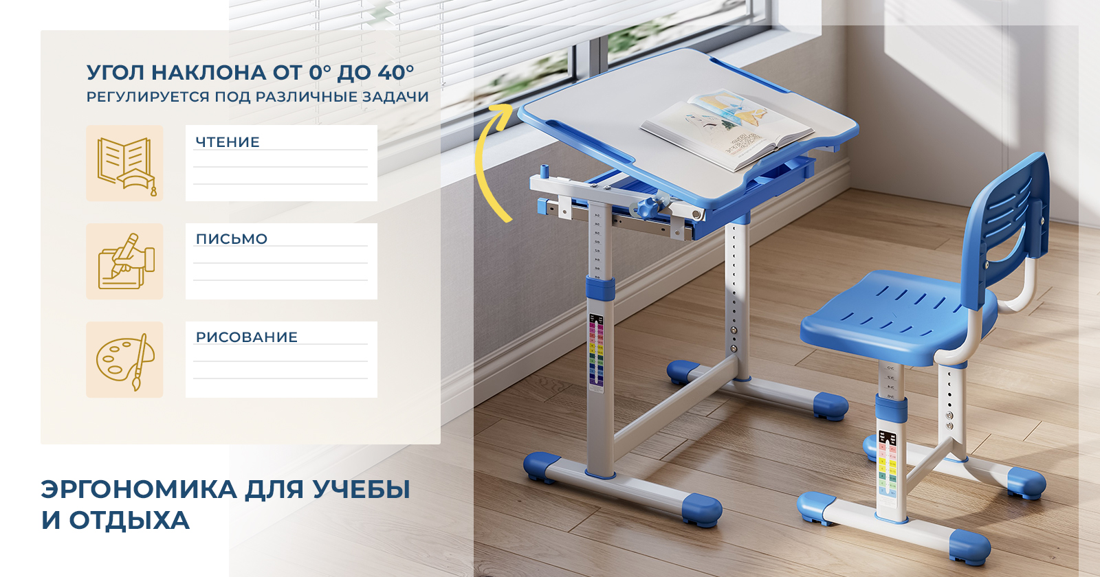 Рабочая поверхность парты регулируется под разные задачи: угол наклона от 0° до 40° позволяет удобно писать, читать или рисовать. Это снижает нагрузку на глаза и позвоночник, делая занятия более комфортными и полезными для здоровья.