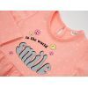 Эффектное, трикотажное платье приятного персикового цвета в маленькие белые принтовые пятнышки, украшенное эффектной серебристой глиттерной надписью «Smile» и милыми симпатичными цветными смайликами.