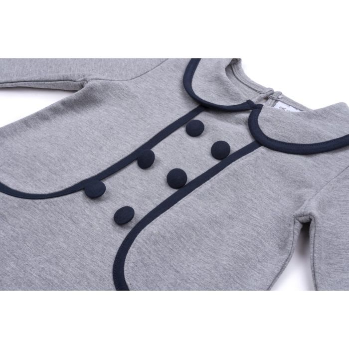 Платье трапецевидного силуэта, с круглым отложным воротником, выполнено из средней плотности, гладкого на ощупь, двухниточного трикотажа. Спереди украшено декоративными темно-синими линиями и такого же цвета пуговицами (пуговицы обтянуты тканью).