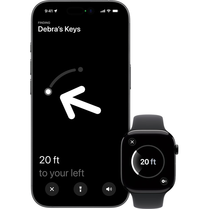 Если AirTag находится неподалеку, iPhone или Apple Watch проведут вас прямо к нему. Благодаря расширенному радиусу точного поиска и встроенной технологии Ultra Wideband вы видите точное расстояние и направление — независимо от того, оставили ли вы вещь на столе или в автомобиле.
