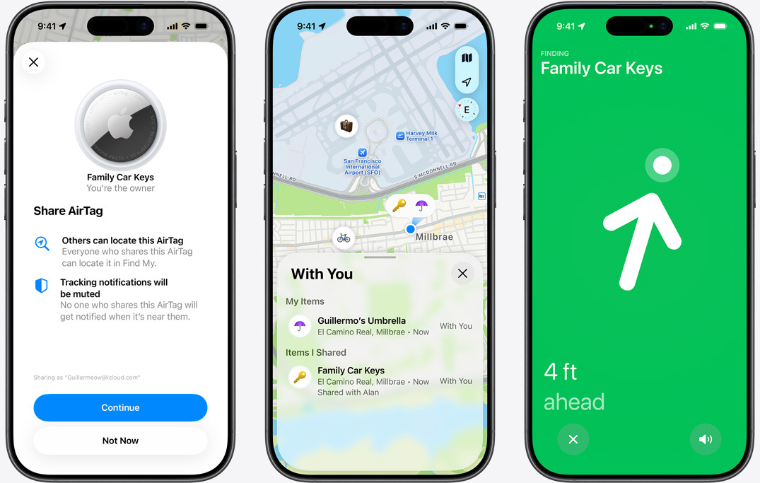 AirTag можно поделить с пятью людьми одновременно. Благодаря этому общие вещи, такие как зонт, велосипед или семейные ключи от авто, могут отслеживаться друзьями и членами семьи без лишних трудностей.