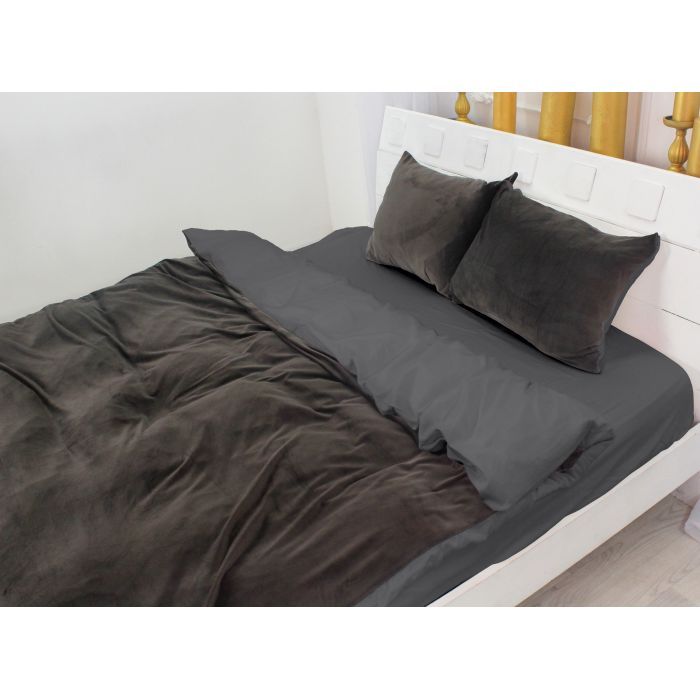семейный, Простынь - 180 х 200 + 25 см, сатин, велюр, однотонные модели, пододеяльник на молнии, простынь на резинке, коричневый с серым