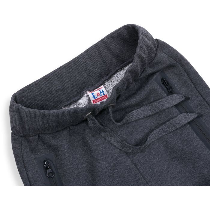 Удобная, уютная и практичная модель с манжетами и хорошей посадкой. Сшита из гладкого, очень приятного на ощупь, плотного турецкого двухниточного трикотажа – 100 % хлопок. Спереди два вертикальных прорезных кармана на молнии, сзади – накладной карман. Передние карманы застёгиваются на интересные (вшитые навыворот) плоские молнии с модными гладкими принтовыми полосами. Манжеты по краям брючин и пояс – из двойной трикотажной «резинки». В пояс дополнительно вставлена широкая резинка и широкий функционирующий шнурок. Шнурок, продет в отверстия усиленные металическими люверсами, которые служат ещё и дополнительным украшением.