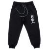 • Удобные, стильные спортивные брюки гладко-черного цвета на манжетах, украшенные стильными аккуратно вышитыми иероглифами белого цвета.