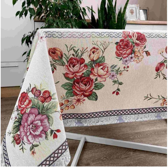 Гобеленовая скатерть украсит гостиную или кухню. Расцветка будет отлично гармонировать со светлыми тонами мебели и текстиля в интерьере. Испанская ткань