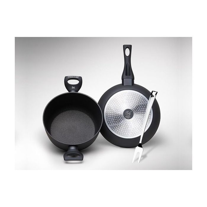 Уникальность изделий этой линейки буквально бросается в глаза: устойчивое к царапинам рифленое антипригарное покрытие с супертвердым рельефом, по которому кухонные инструменты скользят, не задевая поверхность.