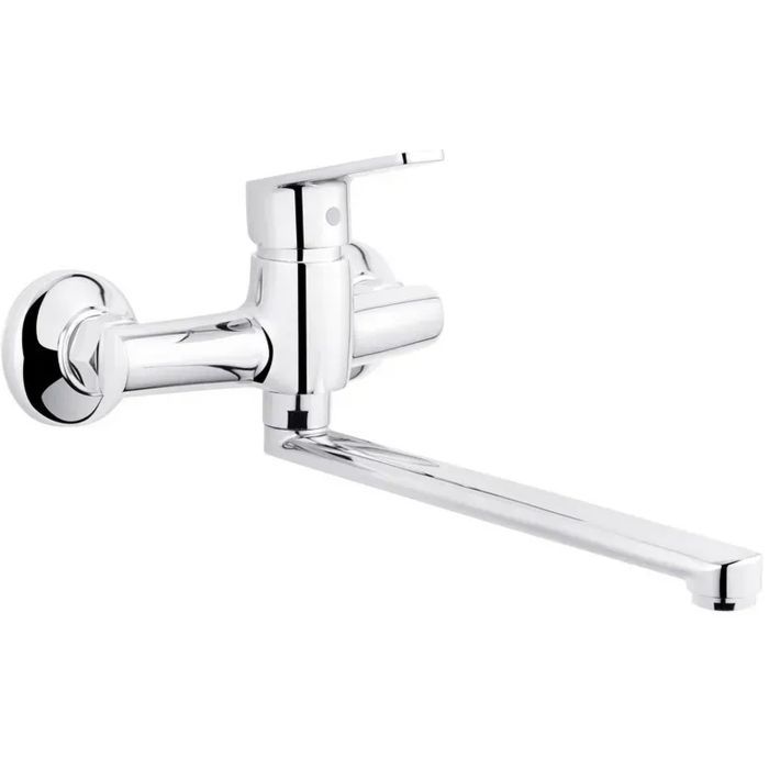 Однорычажный, настенный кухонный смеситель (KRP) Brocken-С040 от Kroner изготовлен из латуни с покрытием хромированного цвета, имеет поворотный излив длиной 21.5 см, и устанавливается на два отверстия посредством эксцентрикового соединения под диаметр 1/2".