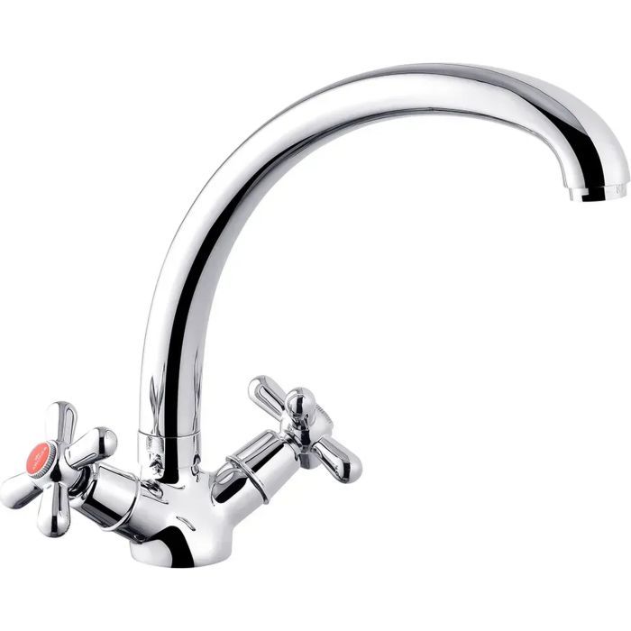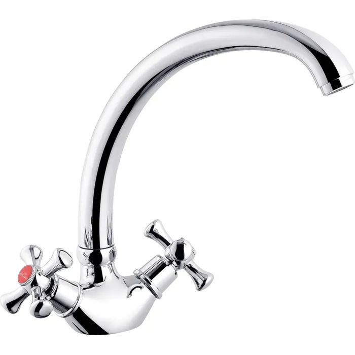 Двухвентильный, врезной кухонный смеситель (KRP) Royce-C032 от Kroner изготовлен из латуни с покрытием хромированного цвета, имеет поворотный излив длиной 22 см, и устанавливается на одно отверстие посредством гибкого шлангового подсоединения под диаметр 1/2".